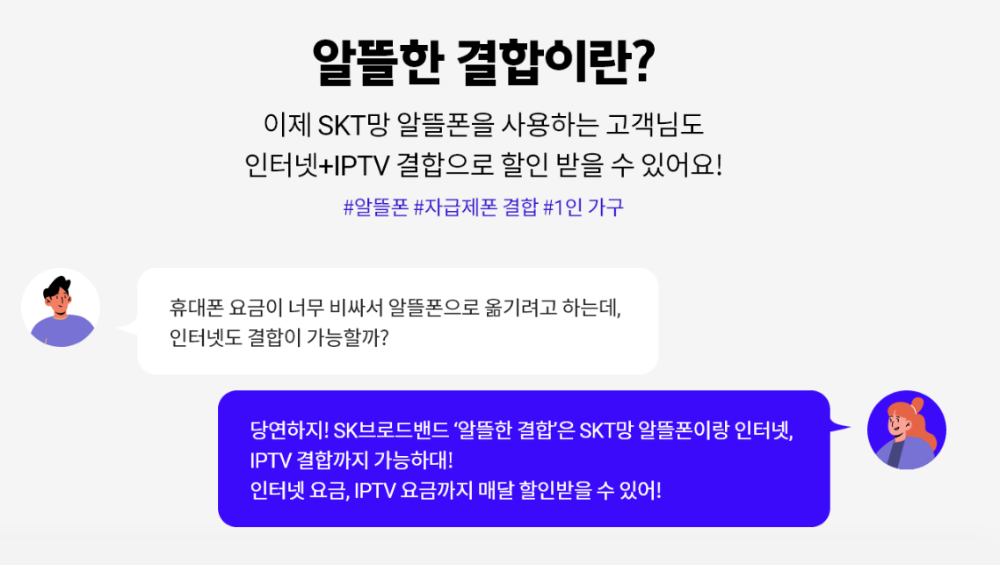 ¾Ë¶ãÇÏ°Ô °áÇÕÇÏ°í ¾È³çÇϼ¼¿ä. ºñ±³¿øÀÔ´Ï´Ù. ¡°¾Ë¶ãÆùÀ» ¾²¸é °áÇÕ ÇÒÀÎÀº ¾È µÇ³ª¿ä?¡± ¡°Àú·ÅÇÑ ¿ä±ÝÁ¦µµ ÀÎÅͳݰú ¹À» ¼ö ÀÖÀ»±î¿ä?¡± 👉 ³×, Á¤´äÀº YES! SK ¾Ë¶ãÇÑ °áÇÕÀ» Ȱ¿ëÇϸé SKT¸Á ¾Ë¶ãÆùÀ» ¾²´Â °í°´µµ ÀÎÅͳݡ¤IPTV¿Í °áÇÕÇØ ¸Å¿ù Åë½Åºñ¸¦ Àý¾àÇÒ ¼ö ÀÖ½À´Ï´Ù. ¿À´ÃÀº SK ¾Ë¶ãÇÑ °áÇÕÀÇ Æ¯Â¡°ú ÇýÅÃÀ» ÀÚ¼¼È÷ Á¤¸®Çص帮°Ú½À´Ï´Ù.