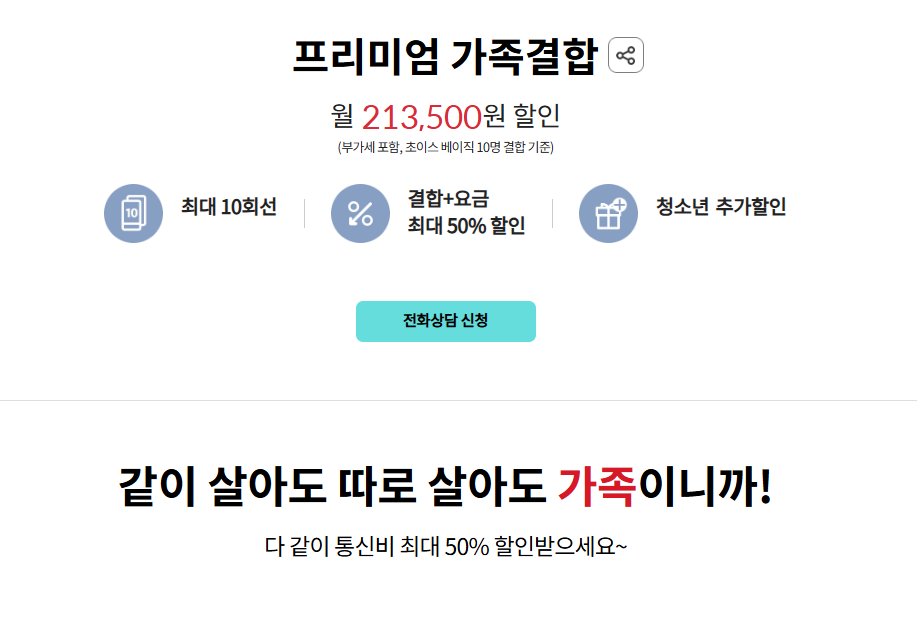 KT ÇÁ¸®¹Ì¾ö °¡Á·°áÇÕÀ̶õ? °¡Á·ÀÌ »ç¿ëÇÏ´Â ÈÞ´ëÆù ȸ¼±À» ÃÖ´ë 10ȸ¼±±îÁö ¹À» ¼ö ÀÖÀ¸¸ç, ÈÞ´ëÆù ¿ä±ÝÀº ÃÖ´ë 50%±îÁö ÇÒÀιÞÀ» ¼ö ÀÖ´Â »óǰÀÔ´Ï´Ù. ¡Ü °¡Á· °£ ÈÞ´ëÆù °áÇÕÀ¸·Î ¿ä±Ý Àý°¨ ¡Ü ÀÎÅͳݡ¤IPTV °áÇÕ ½Ã Ãß°¡ ÇÒÀÎ ¡Ü ÈÞ´ëÆù ¿ä±Ý ÃÖ´ë 50% Àý°¨ °¡´É ¡Ü ´Ù¾çÇÑ ¿¬·É´ëº° ¿ä±ÝÁ¦ Àû¿ë Áï, °¡Á· ¼ö°¡ ¸¹À»¼ö·Ï ÇýÅÃÀÌ Ä¿Áö´Â °áÇÕ ¼ºñ½ºÀÔ´Ï´Ù.